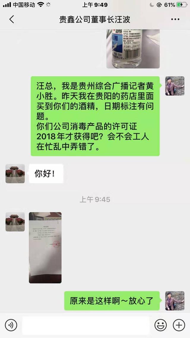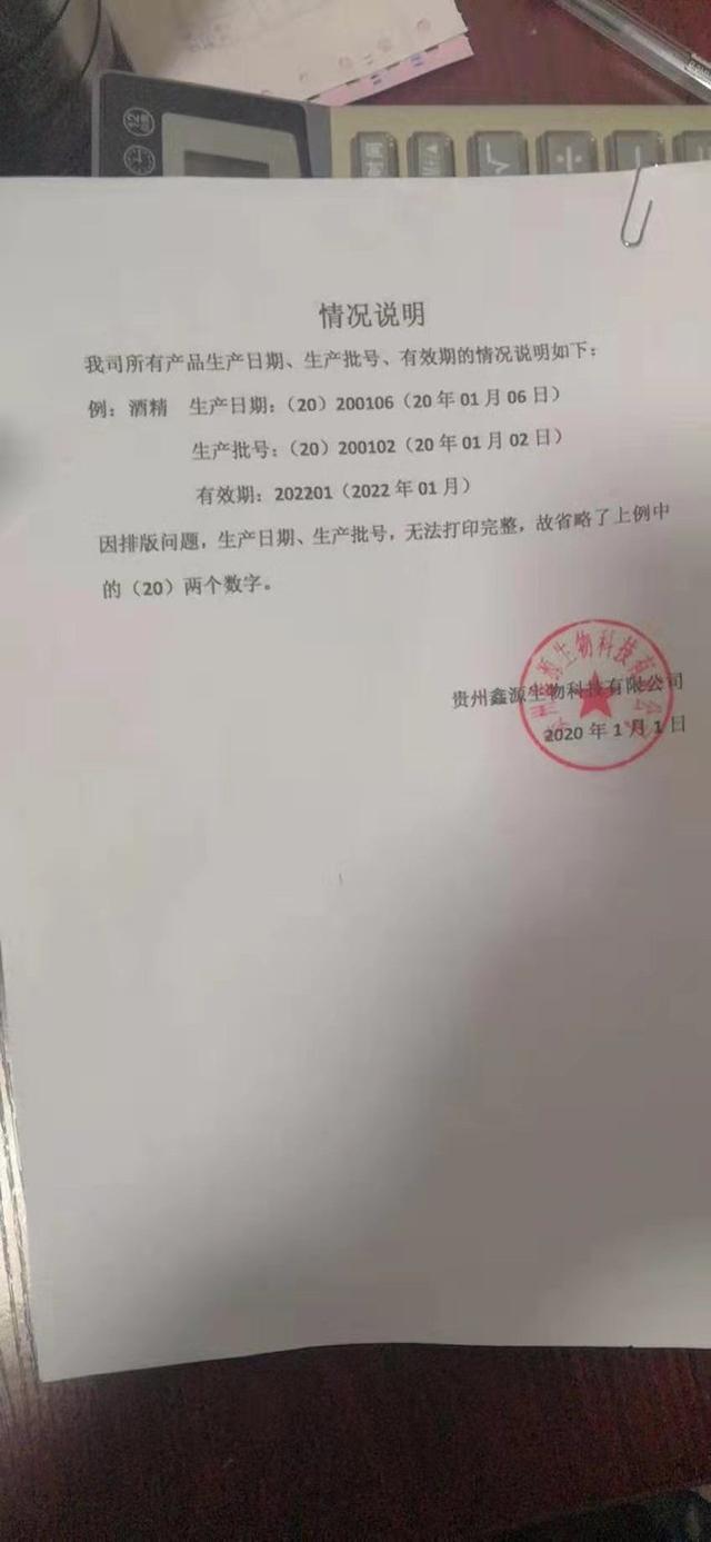 1月31日,記者在位于貴陽(yáng)市都司路的一家藥店購(gòu)買醫(yī)用酒精,每人限購(gòu)兩瓶,100毫升/瓶,每瓶1.5元。當(dāng)天晚上,記者準(zhǔn)備使用酒精時(shí)發(fā)現(xiàn)生產(chǎn)日期有問(wèn)題。于是記者查閱了貴州鑫源生物科技有限公司官網(wǎng)。官網(wǎng)顯示公司成立于2017年。帶著疑惑,記者于2月1日聯(lián)系上貴州鑫源生物科技有限公司董事長(zhǎng)汪波,董事長(zhǎng)給出了答復(fù):“因排版問(wèn)題,生產(chǎn)日期、生產(chǎn)批號(hào),無(wú)法打印完整,故省略了(20)兩個(gè)數(shù)字!